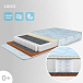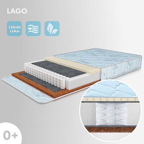 Матрас для подростковой кровати Lago. Максимальная нагрузка на матрас 30 кг. Состав наполнителя:  независиммый пружинный блок 10 см + кокос 1 см + латекс 1 см (двухсторонний), аэраторы, термовойлок. Технология соединения слоев матраса Hot-Melt. Жесткость матраса выбирается по сезонности либо по комфортности, одна сторона матраса обладает жесткостью "выше среднего", другая - "средней" (латекс). Чехол матраса несъёмный, выполнен из хлопкового жаккарда.