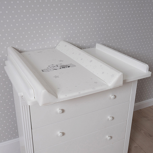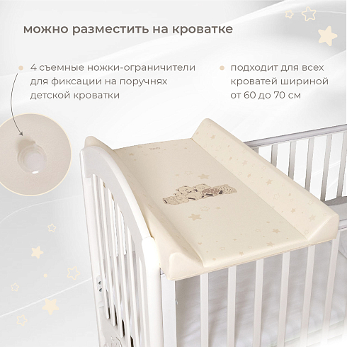 Доска универсальна, ее можно разместить на любой ровной поверхности или зафиксировать на поручнях детской кроватки. Для этого в конструкции предусмотрены съемные ножки-ограничители (6 шт.), благодаря которым доска прочно устанавливается на кровать. Она подходит для всех кроватей шириной от 60 до 70 см и позволяет с максимальным удобством выполнять все гигиенические процедуры ребенку.