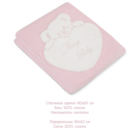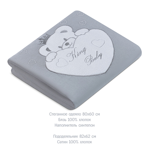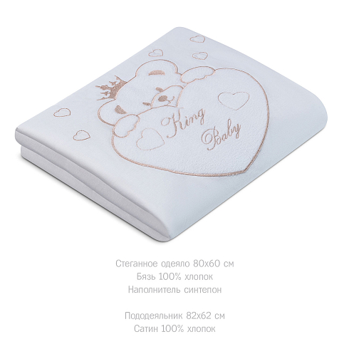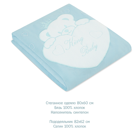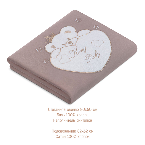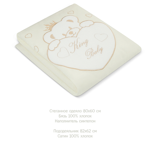 Комплект включает в себя 5 предметов: стеганное одеяло с пододеяльником, удобную простыню на резинке и подушку со съёмной наволочкой.