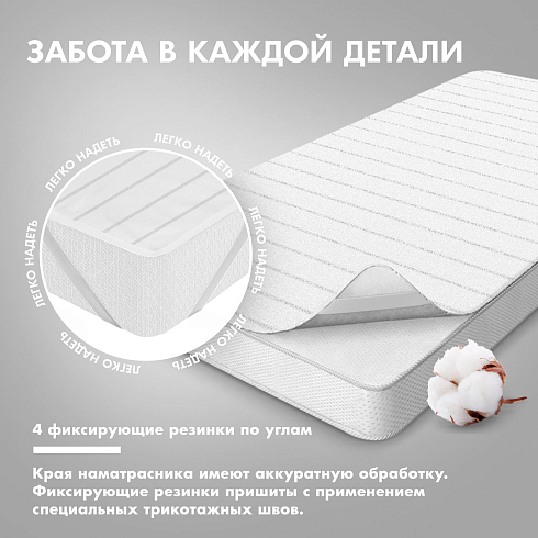 Антибактериальная пропитка ткани снижает риск появления неприятного запаха и является гипоаллергенной, что позволяет применять изделие для всех без исключения детей. Края наматрасника имеют аккуратную обработку. Фиксирующие резинки пришиты с применением специальных трикотажных швов.