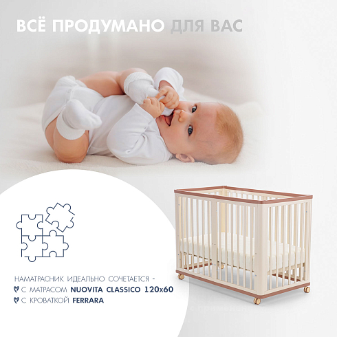 Модели для круглых и овальных кроваток изготовлены с резинкой по всему периметру. Для прямоугольных кроваток предусмотрены резинки по углам. Размеры чехла-наматрасника Nuovita максимально соответствует параметру матраса, что способствует прочной фиксации и исключает случайное сползание.