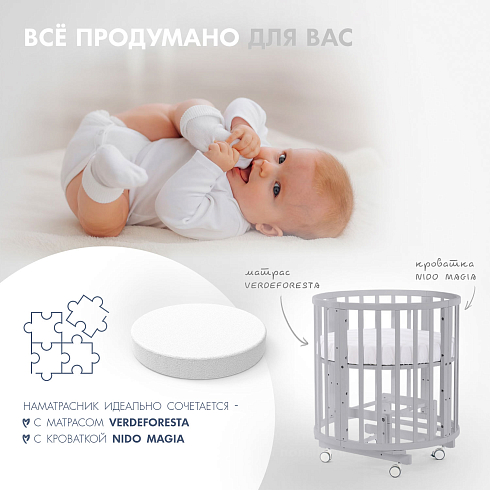 Модели для круглых и овальных кроваток изготовлены с резинкой по всему периметру. Для прямоугольных кроваток предусмотрены резинки по углам. Размеры чехла-наматрасника Nuovita максимально соответствует параметру матраса, что способствует прочной фиксации и исключает случайное сползание.