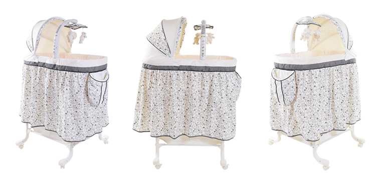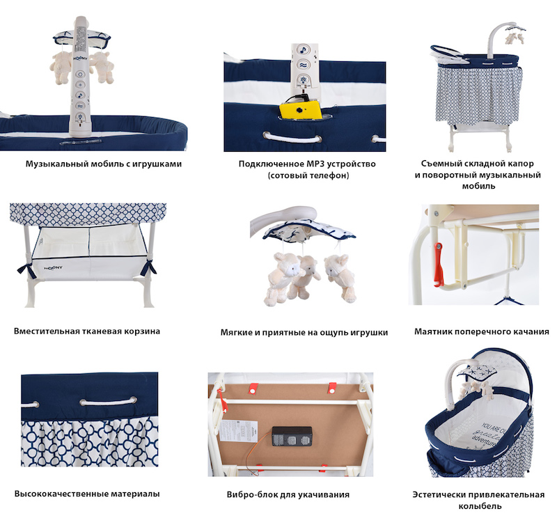 Колыбель включает в себя все самое необходимое: вибро-блок, уникальный маятник качания, регуляторы высоты, ночную подсветку, съемный складной капор и поворотный музыкальный мобиль с игрушками, а также вместительную тканевую корзину для хранения детских принадлежностей. Маятник поперечного качания позволяет раскачивать не всю колыбель, а только уютное спальное место, что наиболее безопасно.